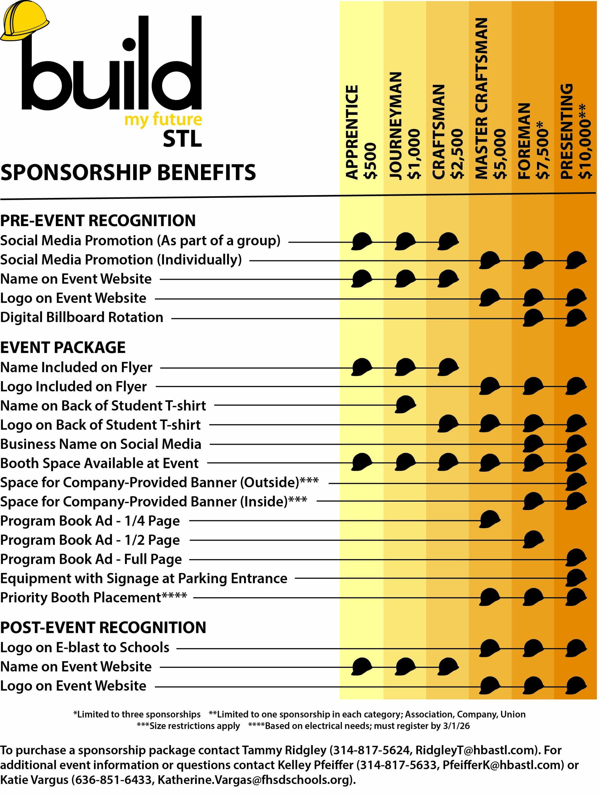 Build My FutureĀ® STL is only possible with support from the construction industries. Sponsorships come in a variety of levels and range from $500-$10,000. This is a prime opportunity for companies to be recognized for being part of an important community initiative! To purchase a sponsorship please complete the application here.